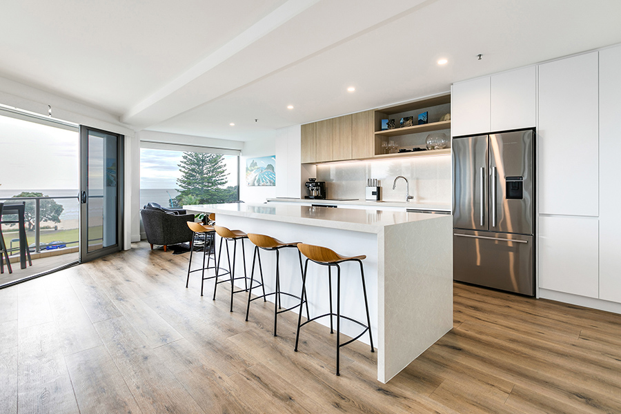 Clever use of space and materials has created this beautifully renovated apartment on Marine Parade, Mount Maunganui which makes use of the sun and views to create a warm and inviting place to relax and unwind